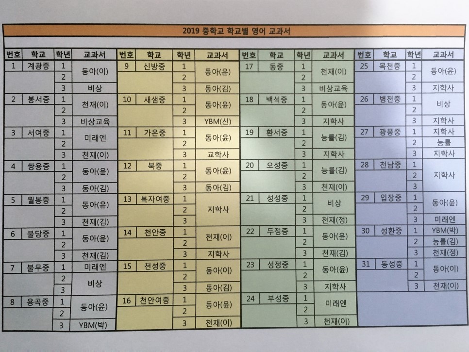 천안 중학교 영어교과서 출판사 현황
