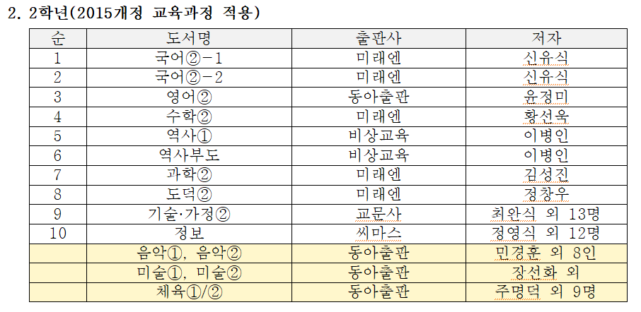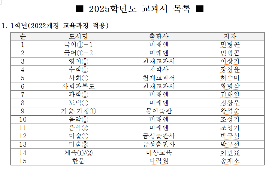 천안 백석중학교 교과서 출판사(2025년)